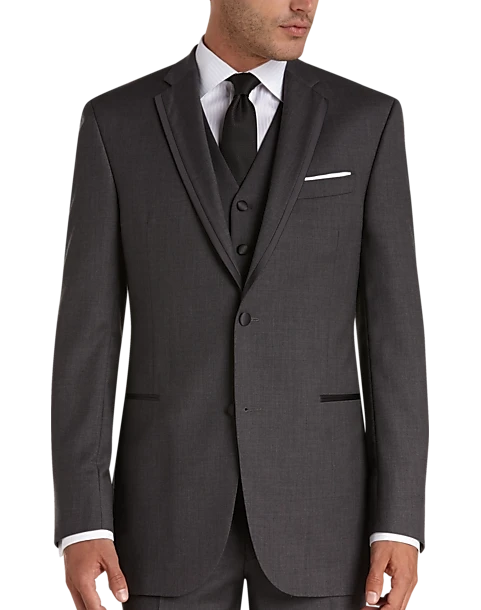 Satin edges on a notch lapel enhance the refined style of this all-gray formalwear staple. Double-pleated trousers feature a satin stripe down the leg adding polish to this timeless look.